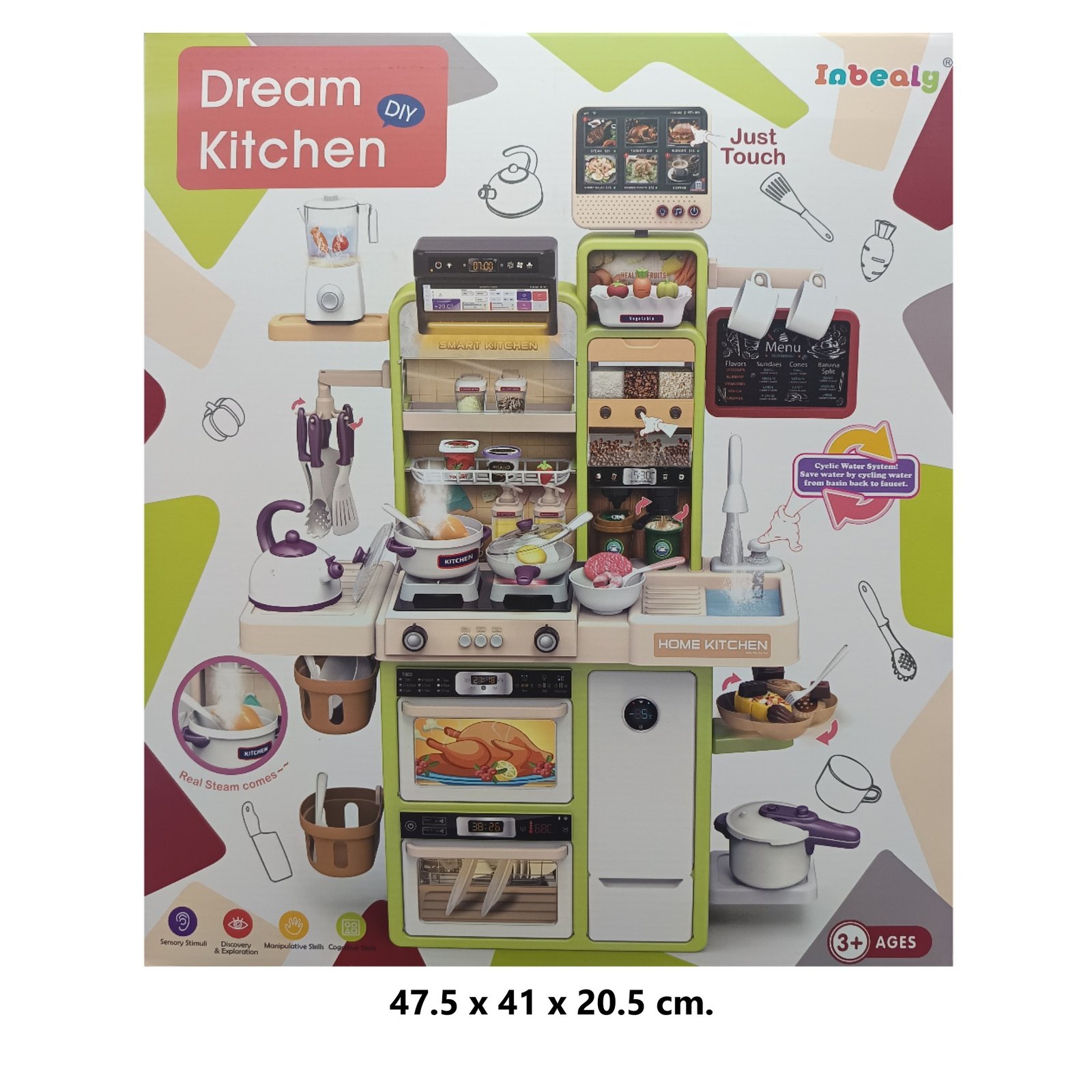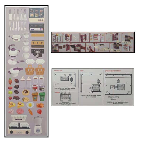 Cocina armada mide 94 x 68.5 x 24 cm. – Tiene dispensador de agua – Accesorios incluidos – Luz y sonido – Funciona con baterias no incluidas – En caja